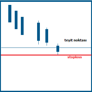 Stoploss olmak için son iki gün oluşan mum çubuklara ait kapanış fiyatlarından en düşük olanına dikkat edilmelidir. Fiyatların yukarı gitmesi beklenirken fiyatlar düşmeye başlamıştır. Gün sonu kapanışı da stoploss seviyesinin altında kalıyorsa, stoploss yapılmalıdır.