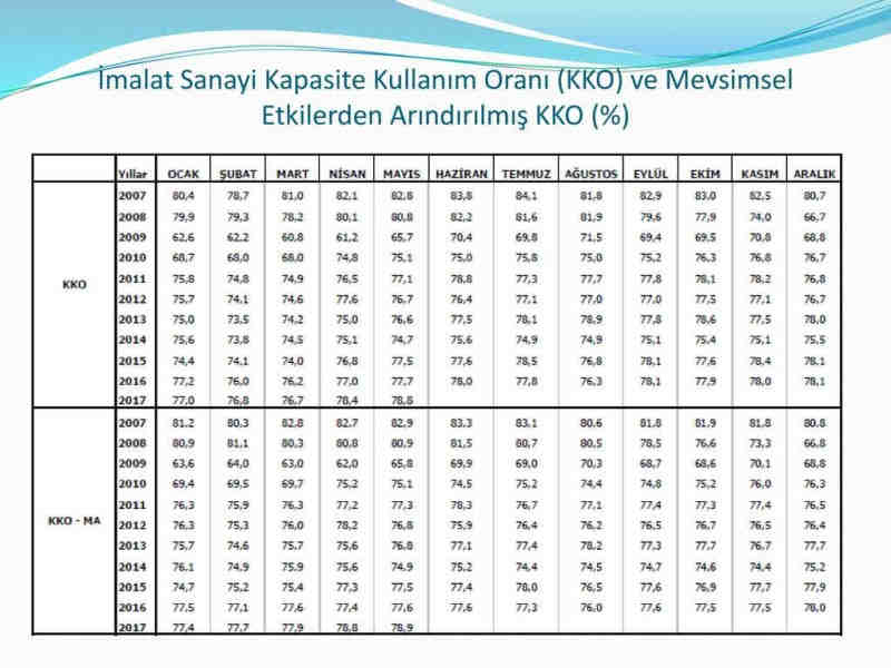 İmalat sanayinde faaliyet gösteren firmaların gerçekleşen kapasite kullanımlarını gösterir. Bu oran, Türkiye’deki imalat sanayi üretiminin gidişatı hakkında bilgi verir. Kısaca KKO da denmektedir.