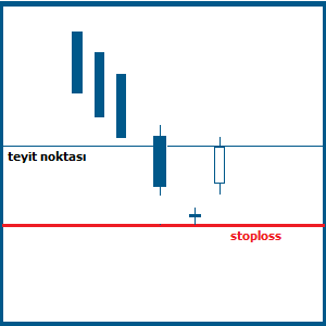 Stoploss seviyesi, ikinci gün oluşan doji mum çubuğun gördüğü en düşük seviye olarak belirlenir. Piyasada fiyatların yukarı gitmesi beklenirken, fiyatlar aşağı doğru düşmeye başlar. Oluşan yeni mum çubuklar, stoploss seviyesinin altına gelir bu durumda stoploss yapmak gereklidir.